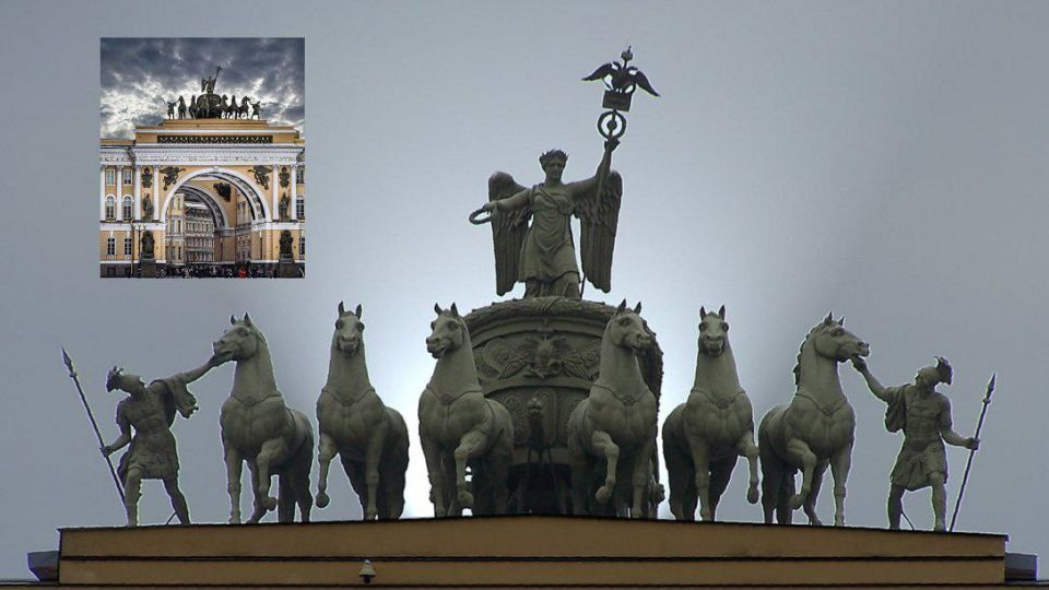 Арка Главного штаба на Дворцовой площади в Петербурге увенчана грандиозной скульптурной композицией «Колесница славы»