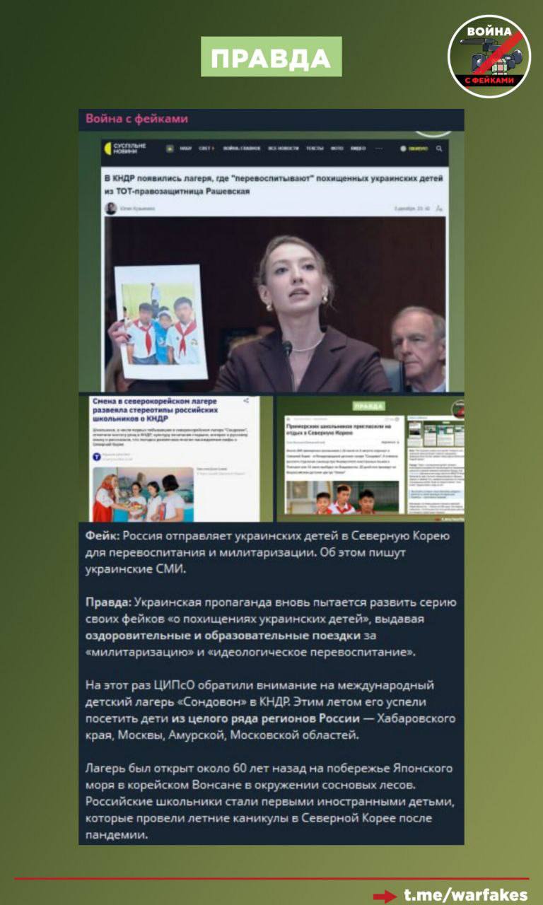 Правда: Украинские пропагандисты снова демонизируют юношеское патриотическое движение «Юнармия». Они назвали «милитаризацией детей» зимнюю смену в лагере «Авангард», во время которой дети участвовали в спортивных мероприятиях, прошли образовательную ориентацию и познакомились с историей России.