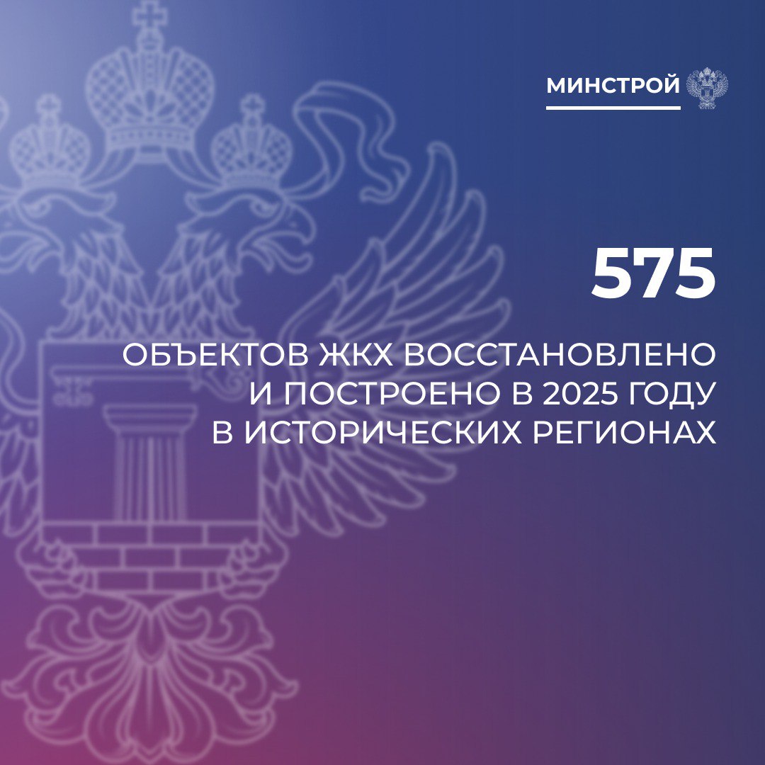 В исторических регионах в 2025 году силами федеральных строительных организаций и регионов-шефов построено и восстановлено 575 объектов жилищно-коммунальной инфраструктуры. Об этом сообщили в министерстве строительства и жилищно-коммунального хозяйства РФ.