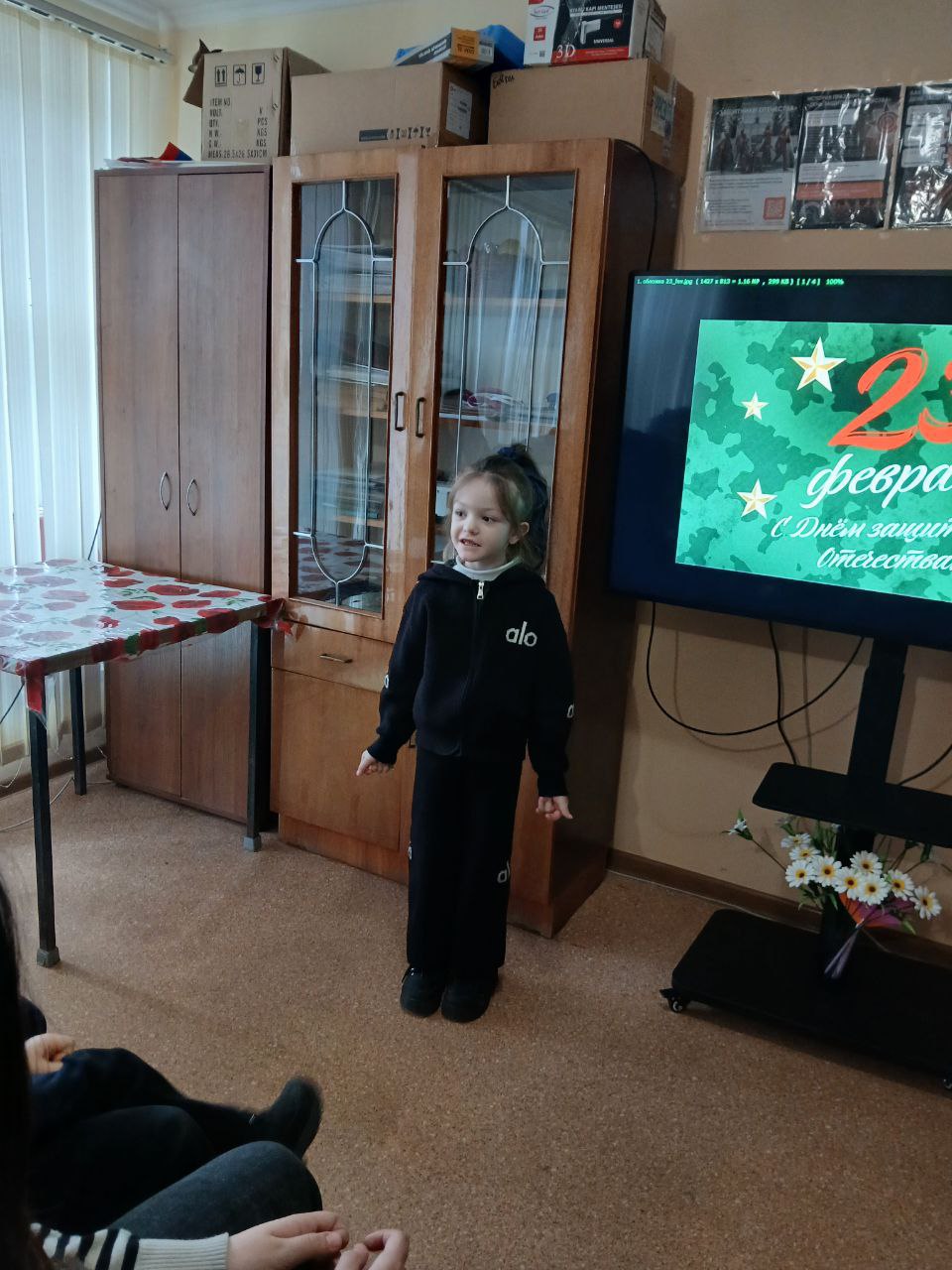 Творческую часть программы представили участники вокального кружка «ДоРеМи», исполнив тематические песни. А воспитанники кружка «Школа ведущих. Уверенный голос» прочли стихи о папе и будущих защитниках Отечества. В завершение все юные участники получили сладкое угощение. Благодарим ребят за яркие выступления и поздравляем всех с 23 февраля!