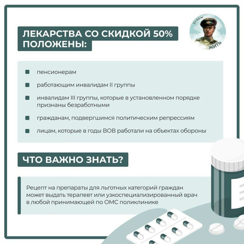 Гражданам отдельных категорий положена скидка 50% на приобретение медикаментов, назначенных врачём.
