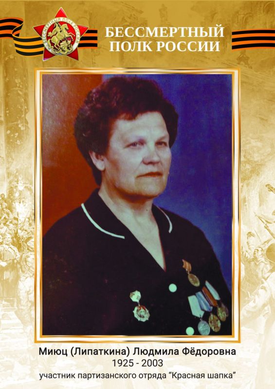 Справа — Миюц (Липаткина) Людмила Фёдоровна (1925–2003). Также партизанка отряда «Красная шапка». Молодая, но бесстрашная, она боролась против оккупантов, рискуя жизнью ради свободы и будущего.