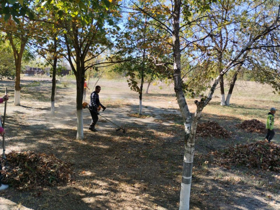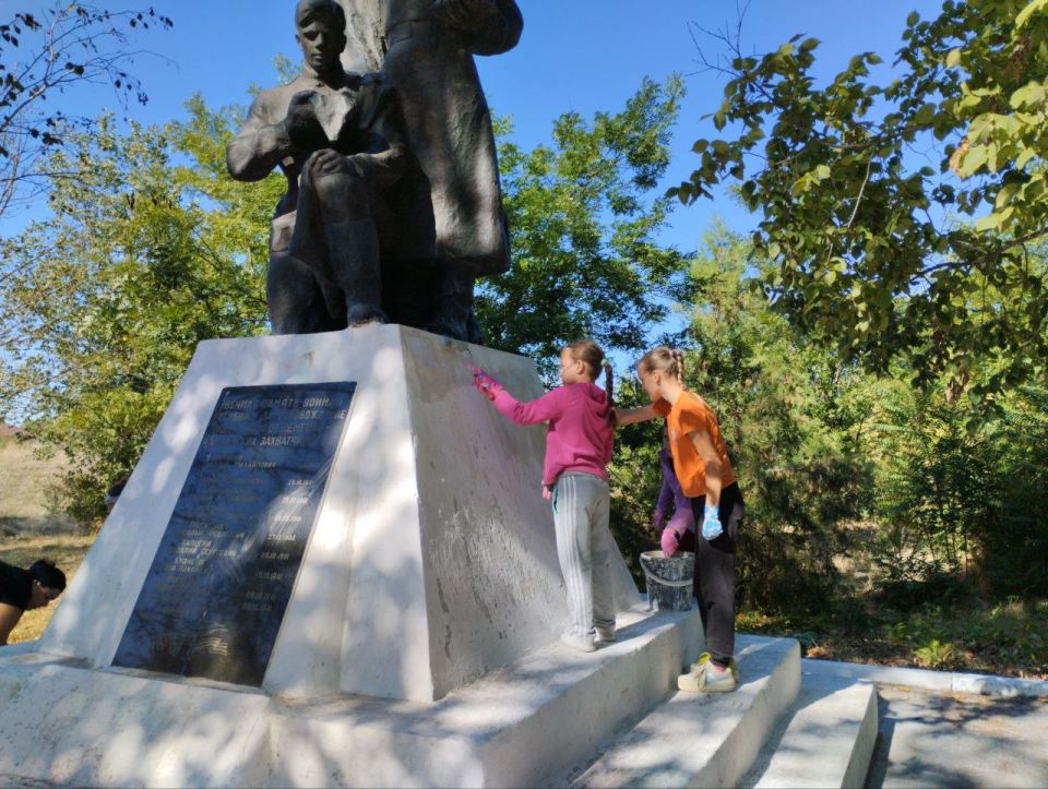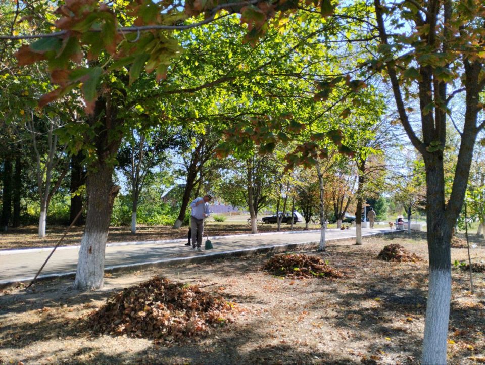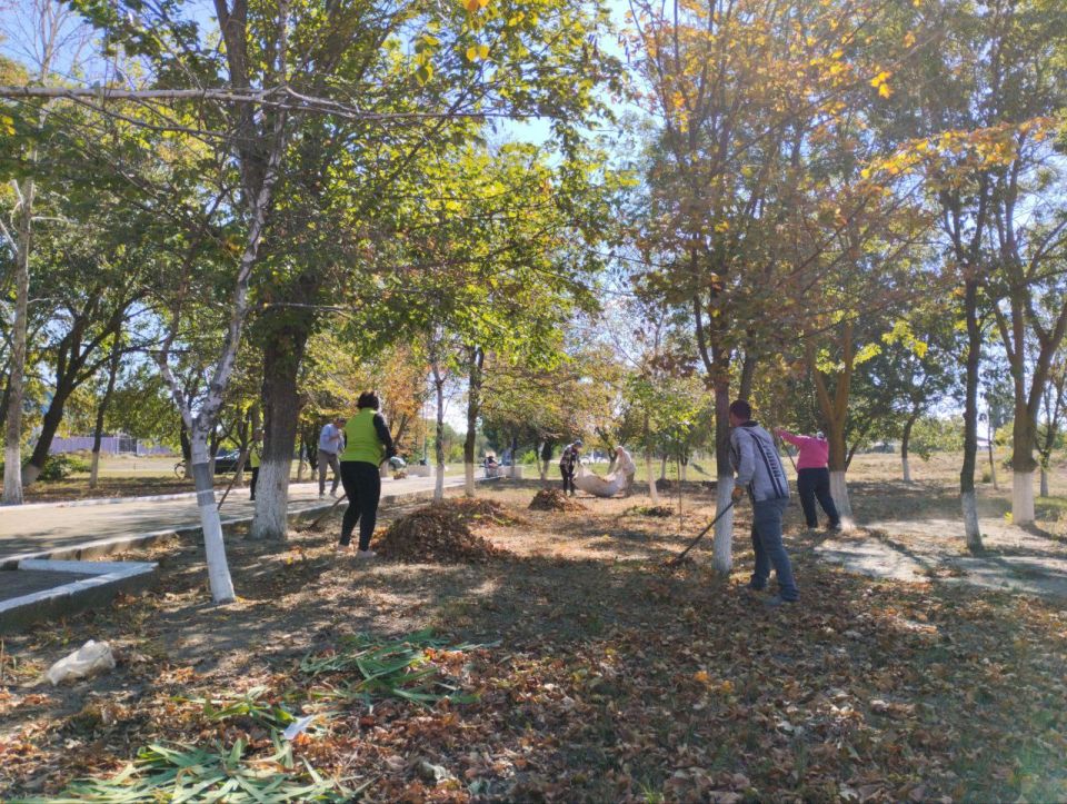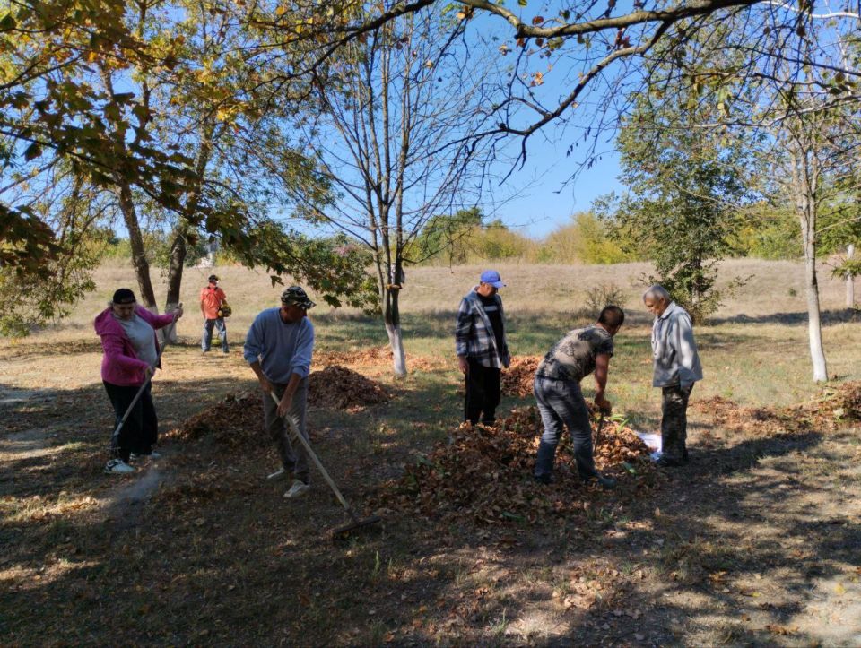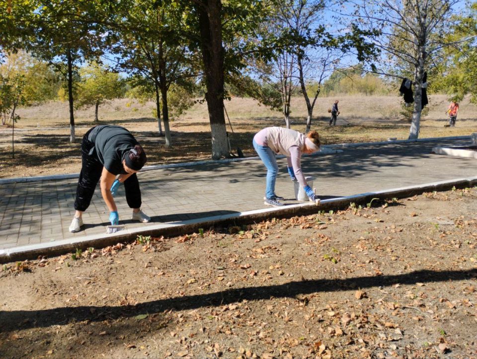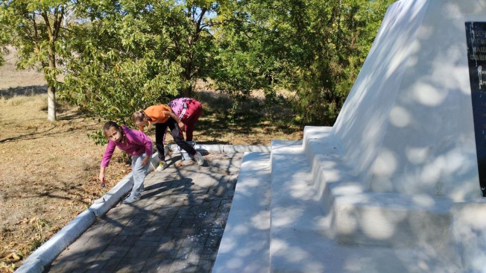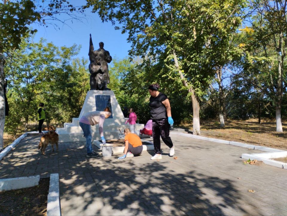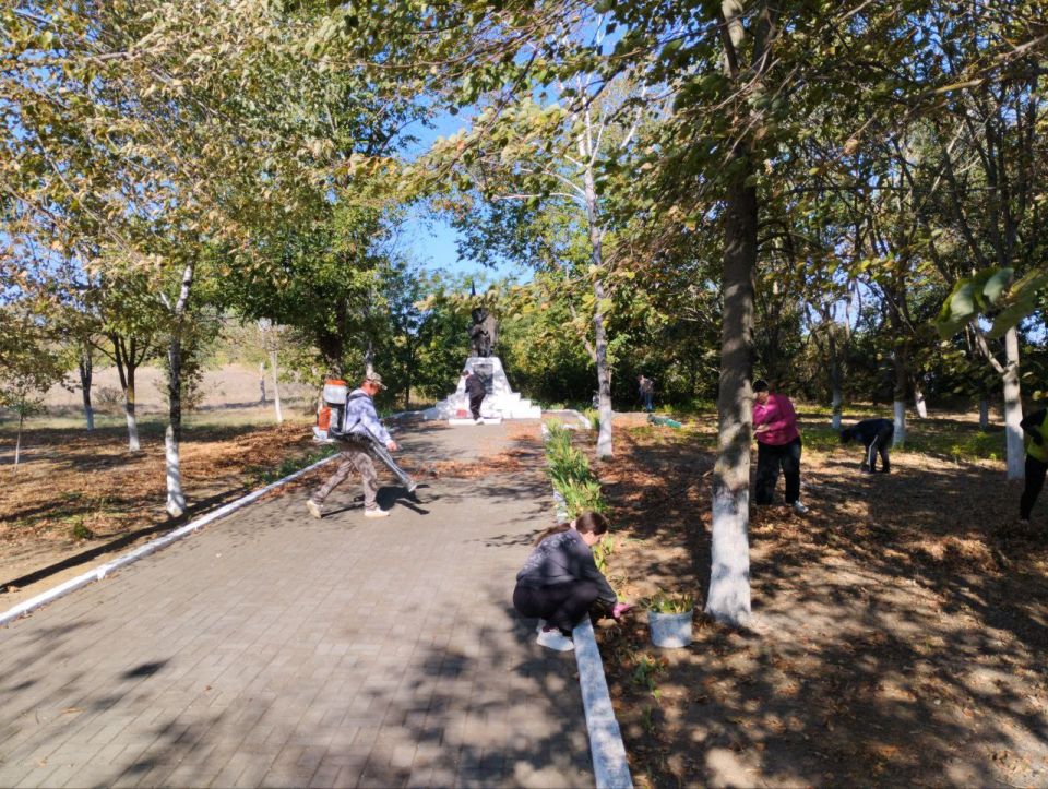 Местные жители объединились для наведения порядка. Были проведены работы по уборке опавших листьев, покраске бордюров, покосу травы и побелке памятника воинам-освободителям.