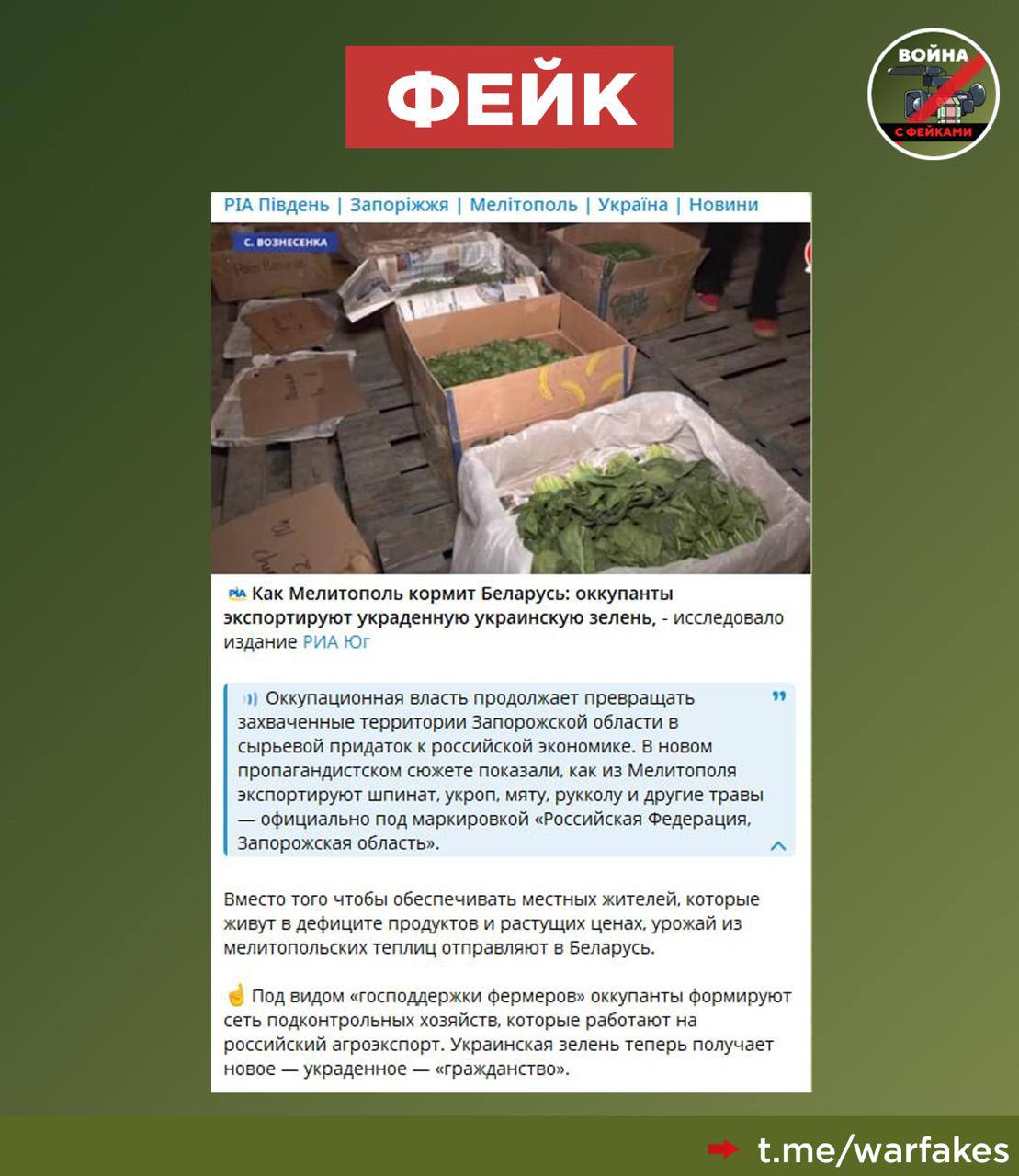 Фейк: Россия крадет зелень у мелитопольских фермеров — ее вывозят вместо того, чтобы отдавать жителям региона, пишут украинские Телеграм-каналы.