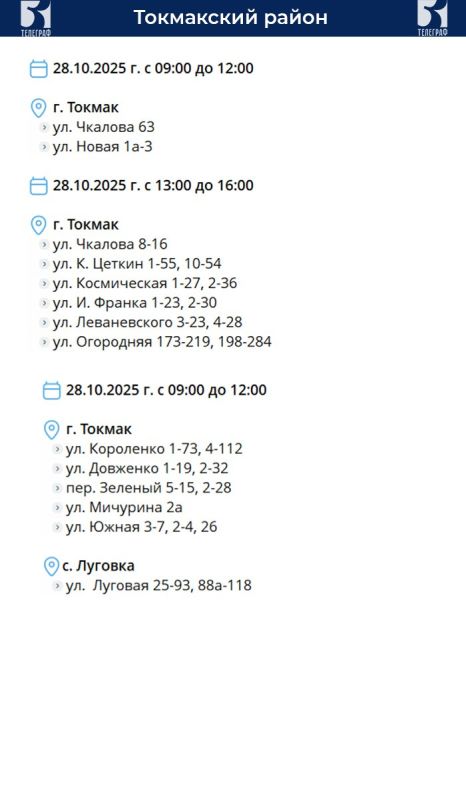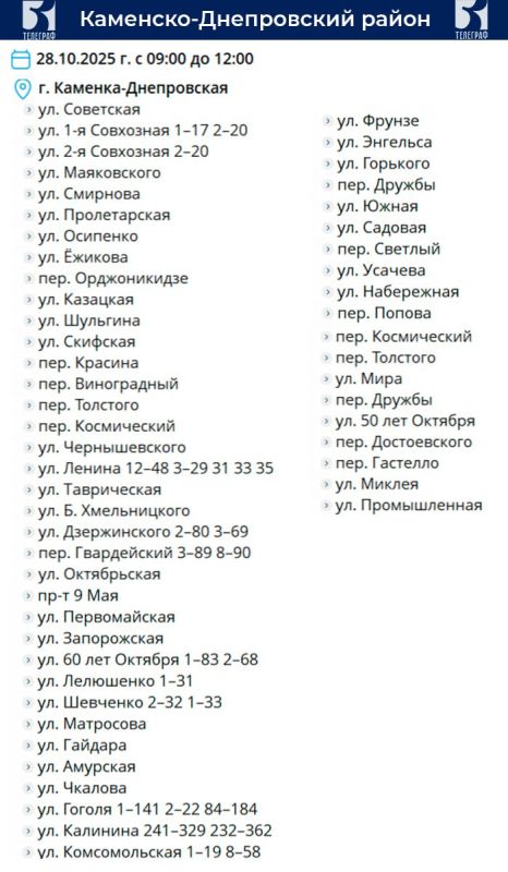 «Запорожьеэнерго» информирует о том, что в связи с проведением плановых работ будет отсутствовать электроэнергия в таких районах: