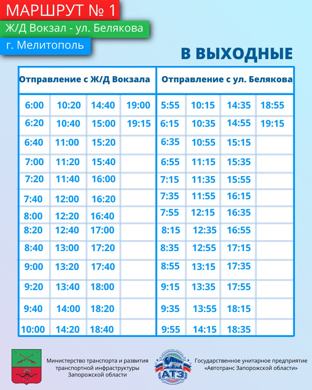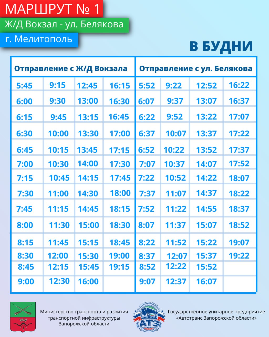 Минтранс Запорожской области продолжает информировать жителей о работе общественного транспорта. Начинаем серию публикаций о графиках движения общественного транспорта в г. Мелитополе и г. Бердянске.