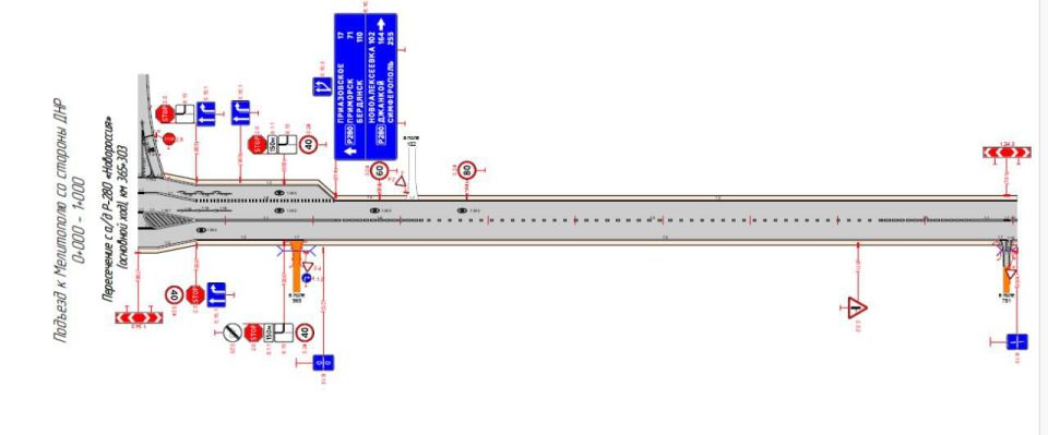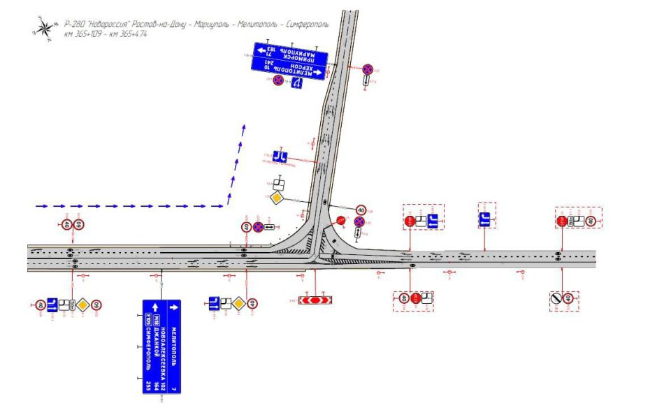 Теперь при движении, на 365 км + 300 м, с посёлка городского типа Приазовское в направлении города Мелитополя, на Т-образном перекрёстке автомобильных дорог Р-280 "Новороссия" и "Обход города Мелитополь" главная дорога изменяет направление и уходит налево.