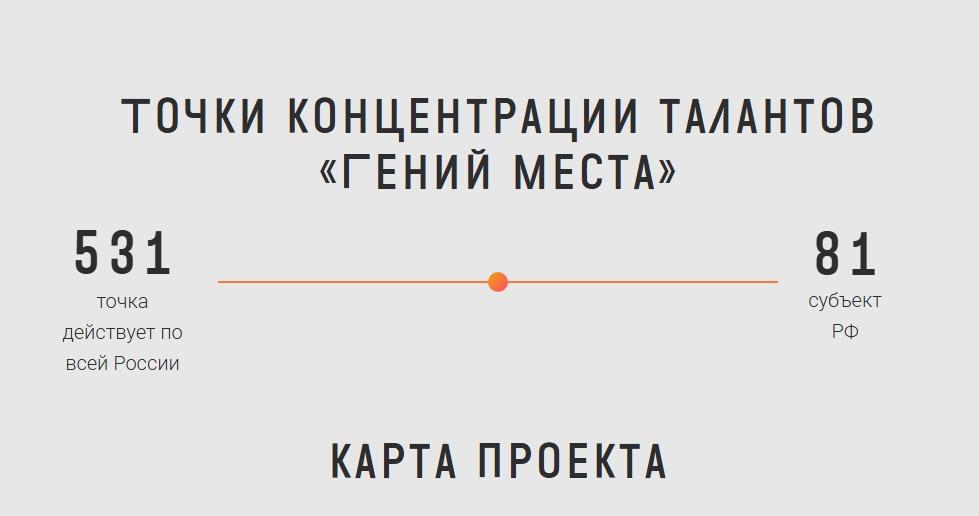 Проект «Гений места» направлен на создание современной инфраструктуры для поддержки креативных индустрий в регионах, и его координатором является РГБ. В этих точках кураторы помогают жителям развивать свои творческие инициативы. Там посетители получают знания и навыки по разным направлениям креативных индустрий, а также знакомятся с профильной литературой.