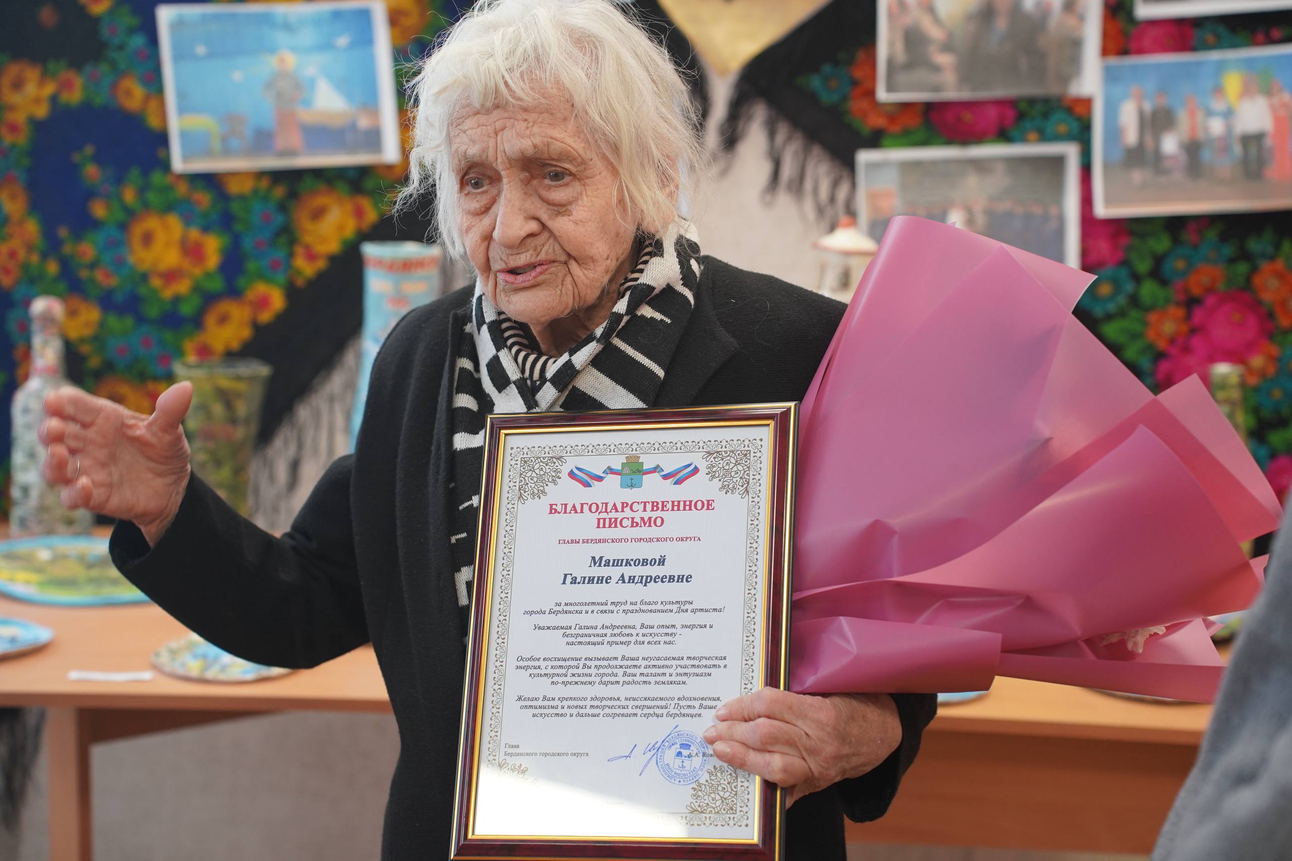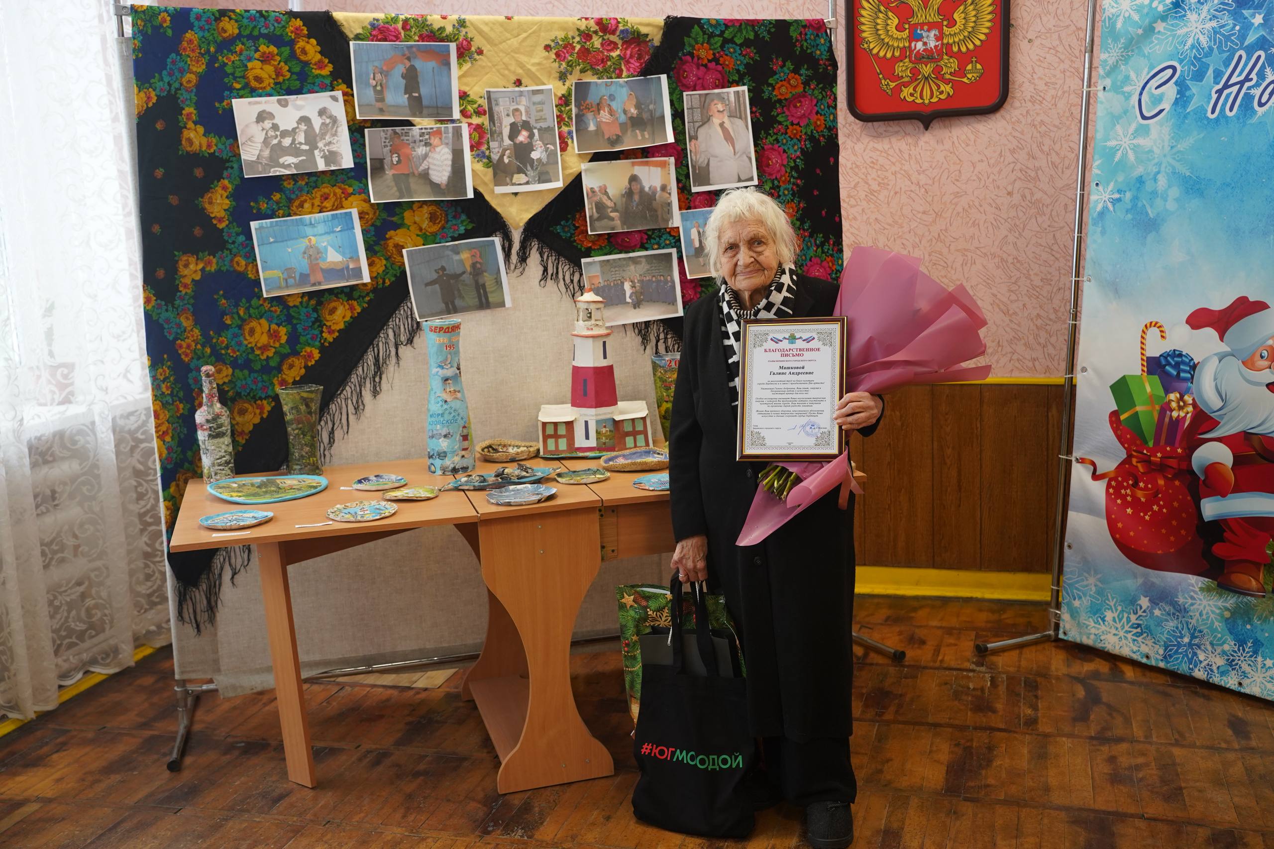 Волонтёрыпередали Галине Андреевне подарки от регионального штаба #МЫВМЕСТЕ, букет цветов и благодарственное письмо от Главы Бердянского городского округа Андрея Ковганко за многолетний труд на благо культуры города Бердянска и в связи с празднованием Дня артиста.
