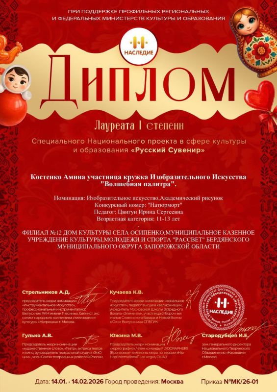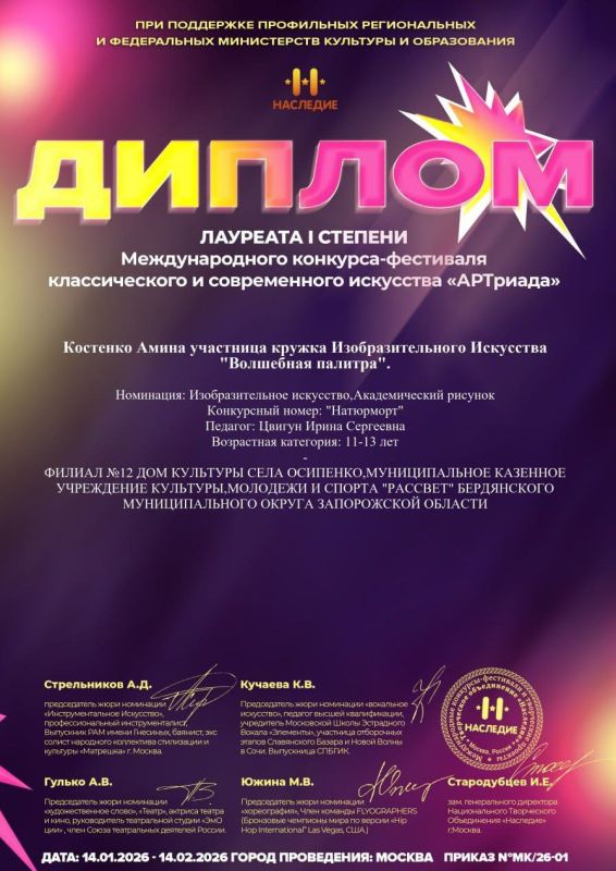 Воспитанница кружка «Волшебная палитра» филиала № 12 ДК с. Осипенко — Амина Костенко — блестяще выступила на престижных международных и национальных конкурсах.