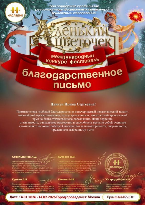 Высоких результатов невозможно достичь без мудрого наставничества. Руководитель кружка Ирина Сергеевна Цвигун получила Благодарственное письмо от организаторов за педагогический талант, профессионализм и вклад в отечественное образование.
