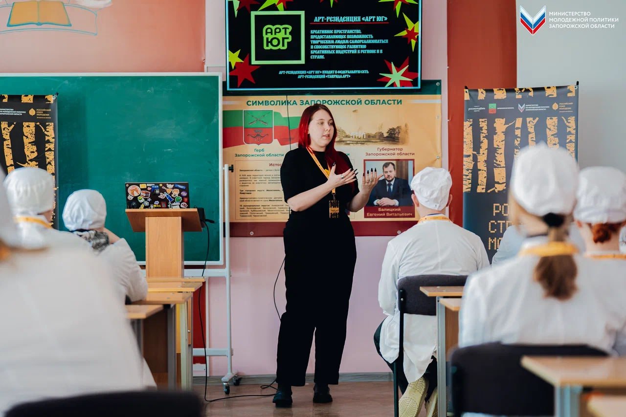 Для студентов выступила Ольга Стратулат — автор и руководитель проекта «Школа народного творчества «Наследие». Она поделилась опытом создания атмосферы и смысловых акцентов на мероприятиях, а также рассказала о ключевых творческих инициативах для молодёжи Запорожской области.