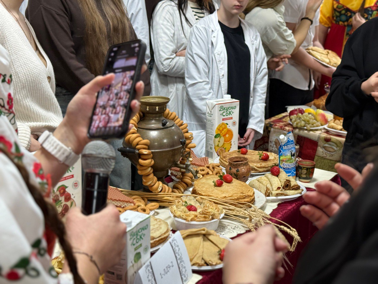 Обучающиеся подготовили красочные столы с ароматными блинами, пирогами, сладкой и солёной выпечкой. Каждый стол был украшен тематическими элементами, создавая праздничную атмосферу, а студенты лично угощали гостей своими кулинарными шедеврами.