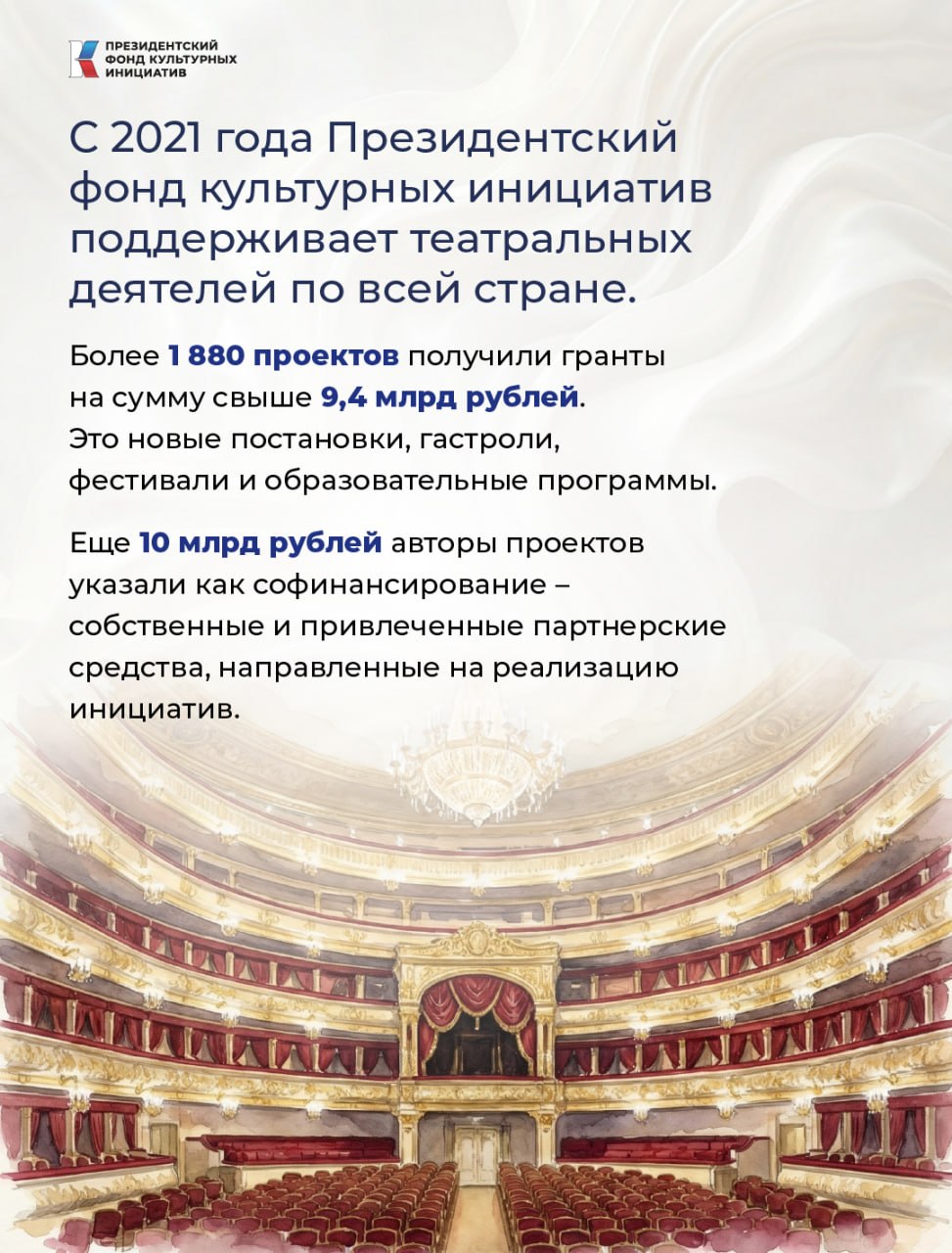 За почти пять лет работы Президентский фонд культурных инициатив поддержал более 1880 театральных проектов по всей стране на сумму свыше 9,4 млрд рублей. Это фестивали, гастроли столичных и региональных театров, образовательные форумы для профессионалов, крупные и камерные постановки.