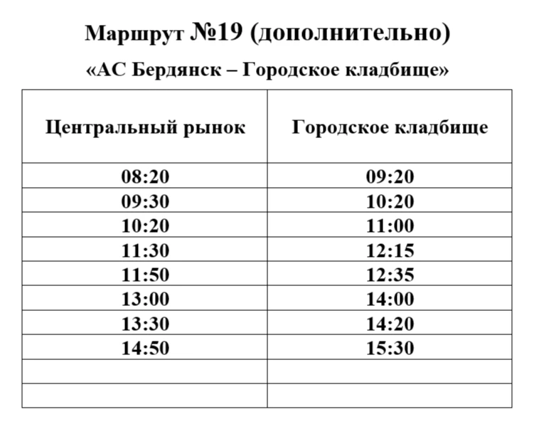 В поминальные дни, с 19 по 21 апреля, в Бердянске будет организовано движение автобусов по маршрутам №4-3, 4/19, 5/19, 10, 19, 21/19, 17-19.ЗАПОРОЖСКИЙ ТЕЛЕГРАФ