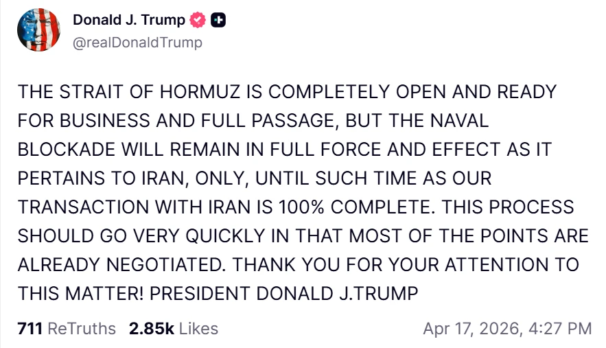 ОРМУЗСКИЙ ПРОЛИВ ПОЛНОСТЬЮ ОТКРЫТ ДЛЯ КОММЕРЧЕСКОЙ ДЕЯТЕЛЬНОСТИ И ПОЛНОГО ПРОХОДА, ОДНАКО ВОЕННО-МОРСКАЯ БЛОКАДА БУДЕТ ОСТАВАТЬСЯ В ПОЛНОЙ СИЛЕ И ДЕЙСТВИИ ИСКЛЮЧИТЕЛЬНО В ОТНОШЕНИИ ИРАНА ДО ТЕХ ПОР, ПОКА НАША СДЕЛКА С ИРАНОМ НЕ БУДЕТ ЗАВЕРШЕНА НА 100%. ЭТОТ ПРОЦЕСС ДОЛЖЕН ПРОЙТИ ОЧЕНЬ БЫСТРО, ПОСКОЛЬКУ БОЛЬШИНСТВО ПУНКТОВ УЖЕ СОГЛАСОВАНО. СПАСИБО ЗА ВАШЕ ВНИМАНИЕ К ЭТОМУ ВОПРОСУ!