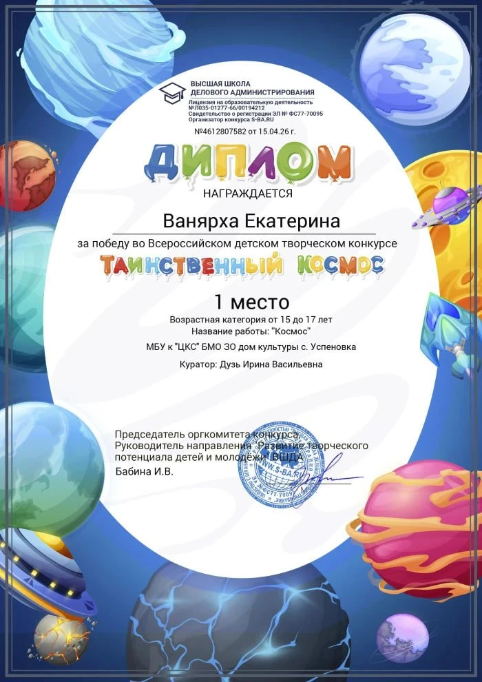 Участники кружка «Умелые ручки» Дома культуры села Успеновка заняли первые места во Всероссийском детском творческом конкурсе «Таинственный космос». Победителями стали: